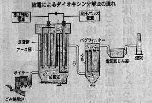 現在進められている研究のーつが排ガス中で放電することによってダイオキシンを分解する方法です。