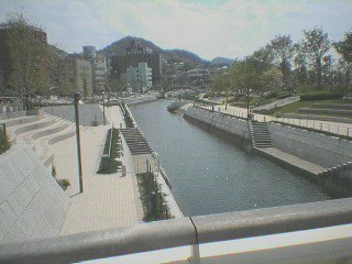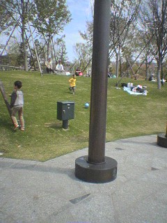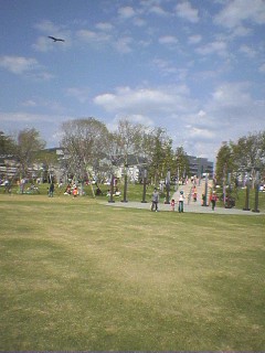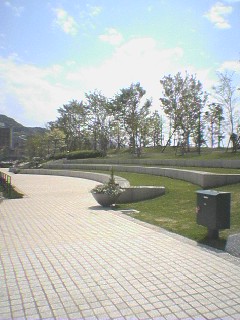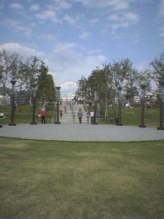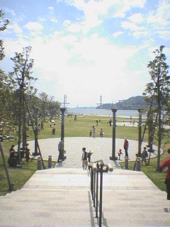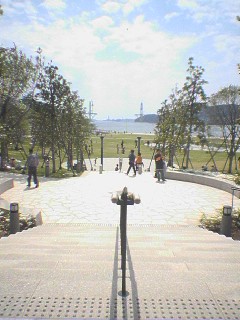 公園のメーンゲートから通じる階段を昇り、円形舞台へ通じる階段を降ります。正面に港口の女神大橋が見えます。