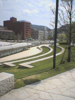 レストラン裏の階段席(運河の向こう側)と、芝生付き階段席(いずれも電源コンセントがある)